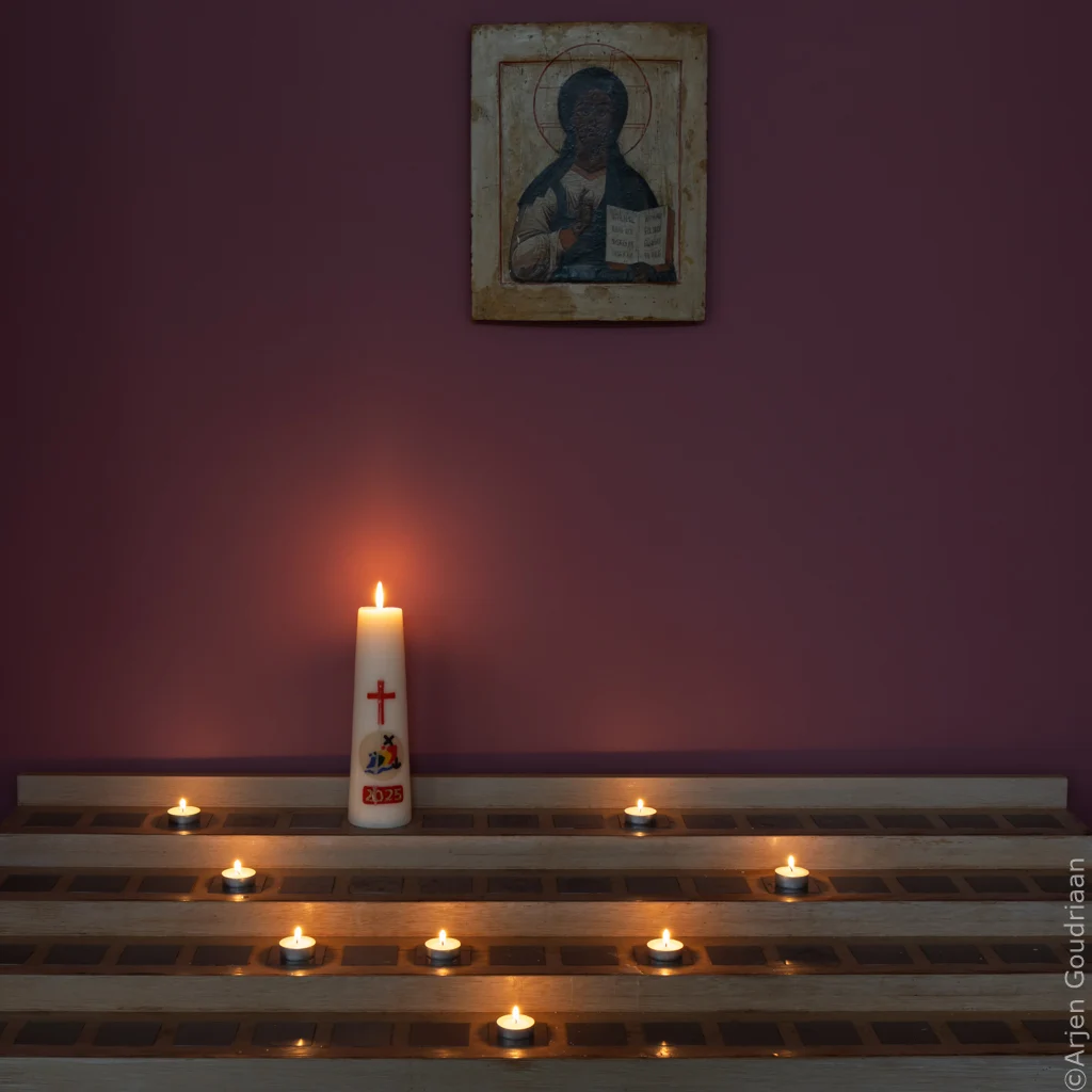 Verstild(Klik, of tik op een tegel voor een grotere foto)Gedachtenishoekje in kerk, met brandende Paaskaars en enkele waxinelichtjes.Hoge treurwilg bij slotgracht van ruïne van Egmond.Blik in de Basiliek van Oudenbosch.